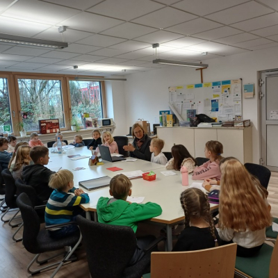 Die 4. Klassen nahmen am Workshop „Fit für's Smartphone“ der Medienpädagogin Frau Goldstein teil. Dabei lernten sie, wie man sicher und verantwortungsvoll mit dem Handy umgeht und welche Gefahren bzw. Herausforderungen es gibt.'...